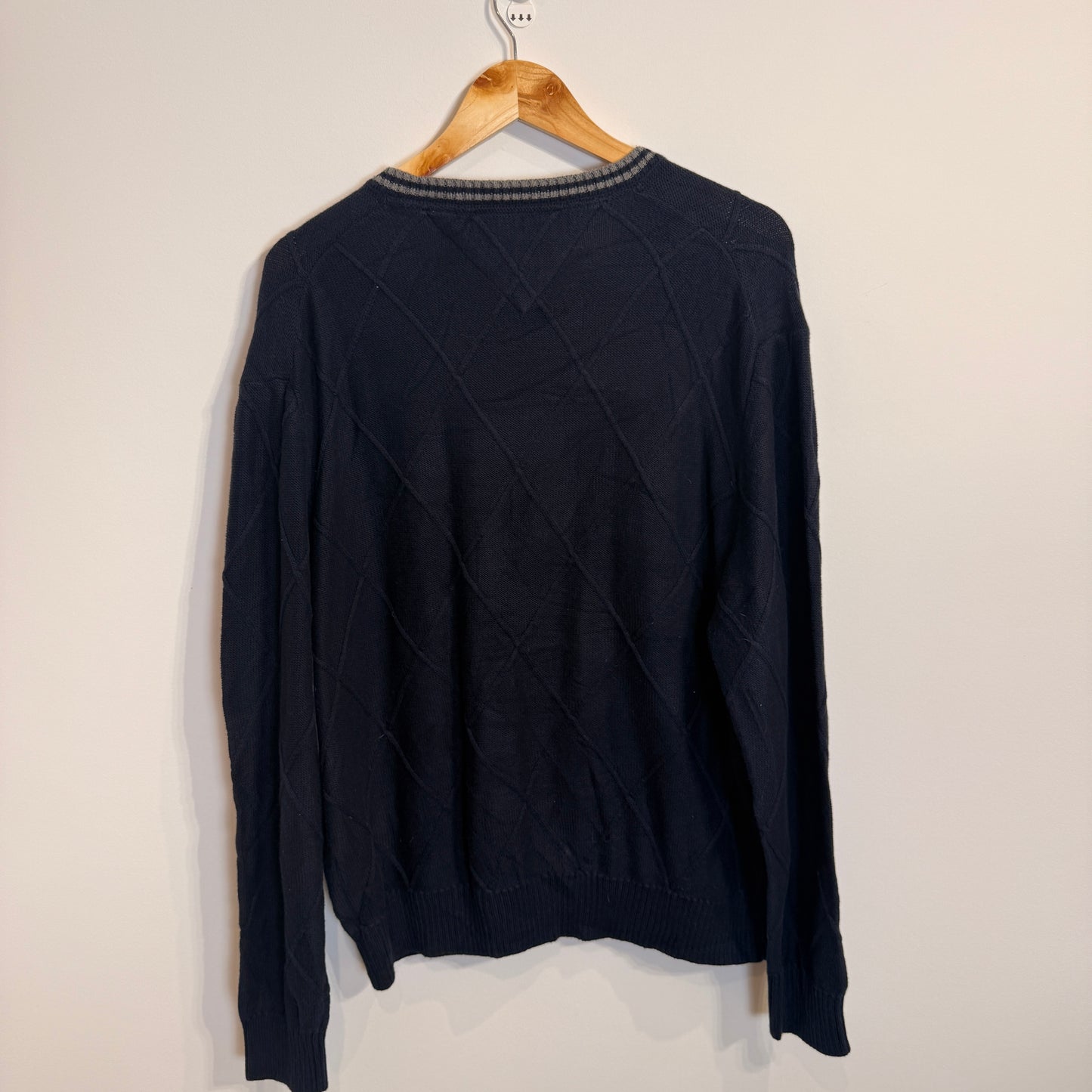 Add Tommy Hilfiger Navy Blue Cotton Jumper with Grey Stripe Neckline and Quilted Pattern to the cart