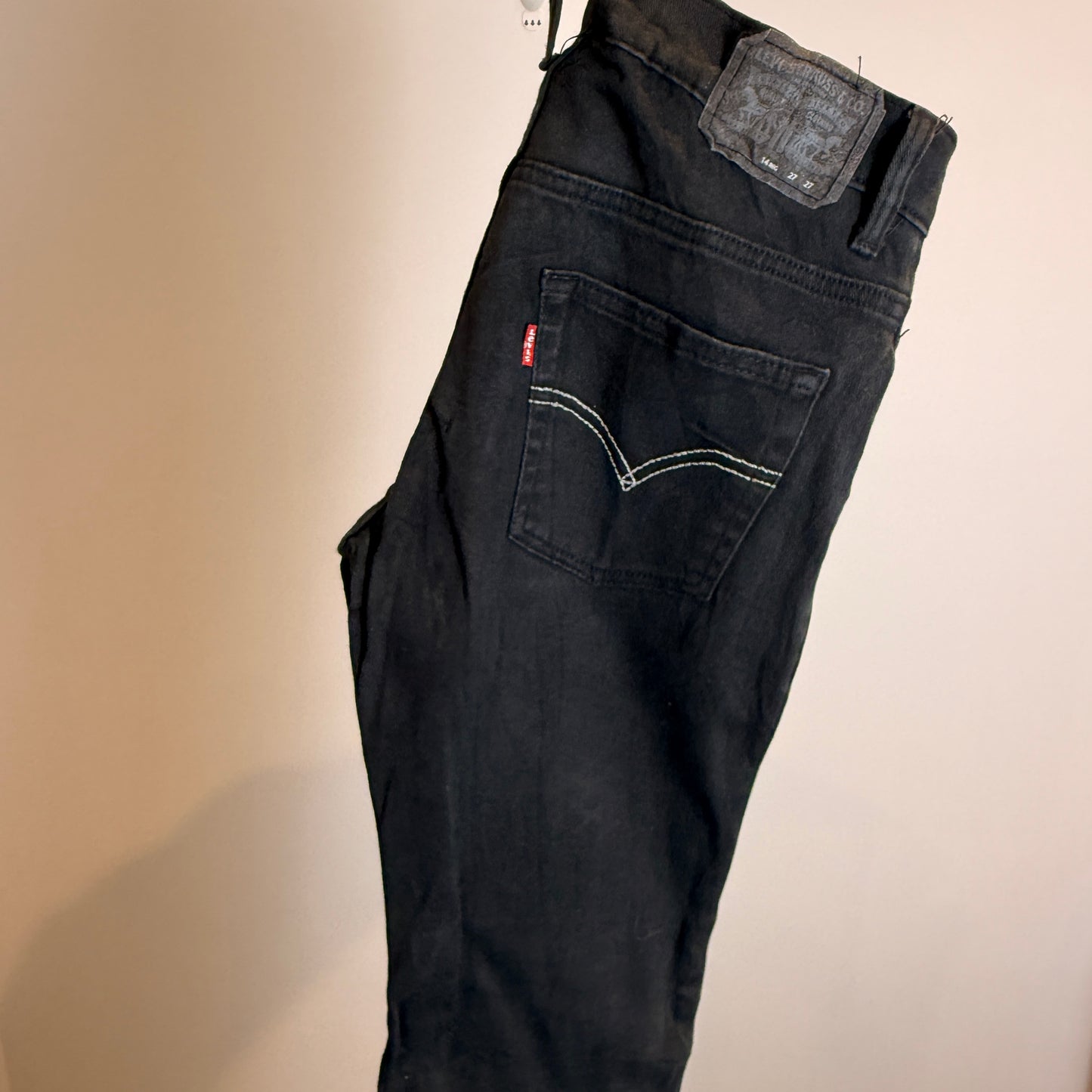 Color & Details: Jet Black; features classic Levi’s red tab branding, five-pocket design, and tonal stitching for a sleek finish