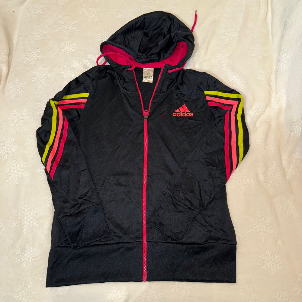 Lightweight Adidas hooded zip-up jacket featuring a bold pink zipper and neon stripe detailing on both sleeves, ideal for casual wear or light training.