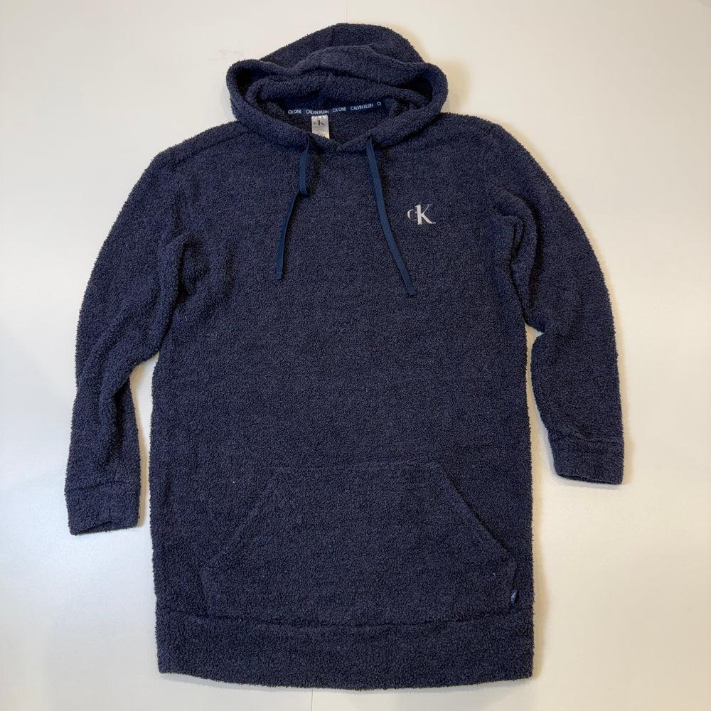 Soft Calvin Klein (CK One) teddy fleece hoodie in grey, designed in a longer length for a hoodie dress fit, with embroidered chest logo and kangaroo pocket.