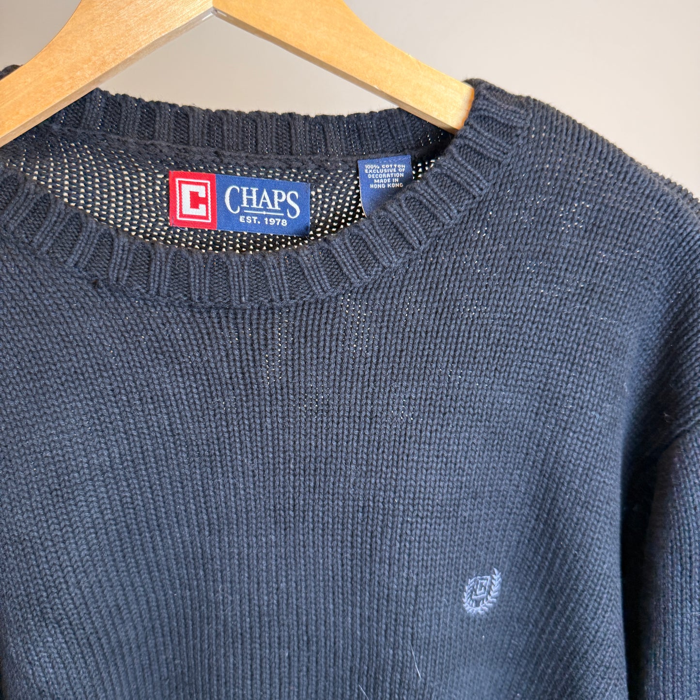 Color & Details: Classic Black with ribbed cuffs, collar, and hem for a refined finish; subtle Chaps logo embroidery on chest