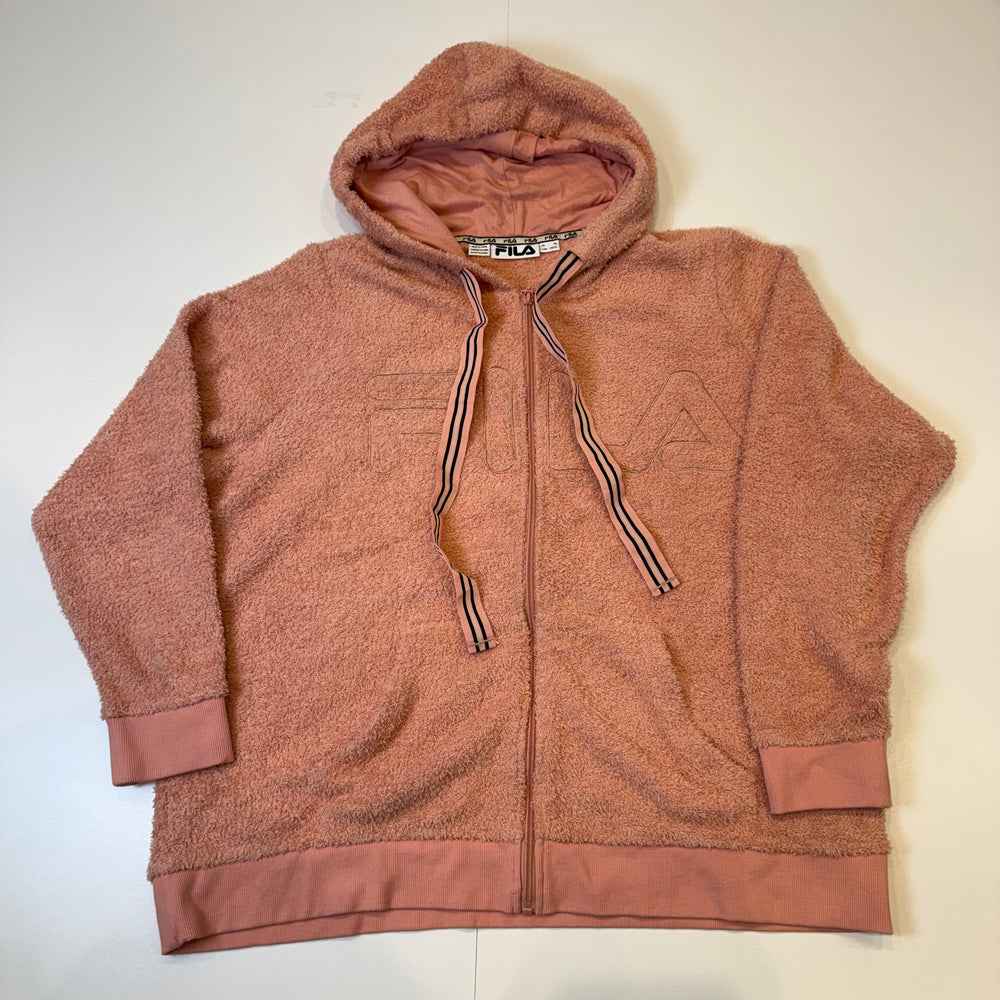 Soft FILA teddy fleece zip-up hoodie in a light pink colour, featuring an embossed logo across the chest, full zip closure, and striped drawstrings.