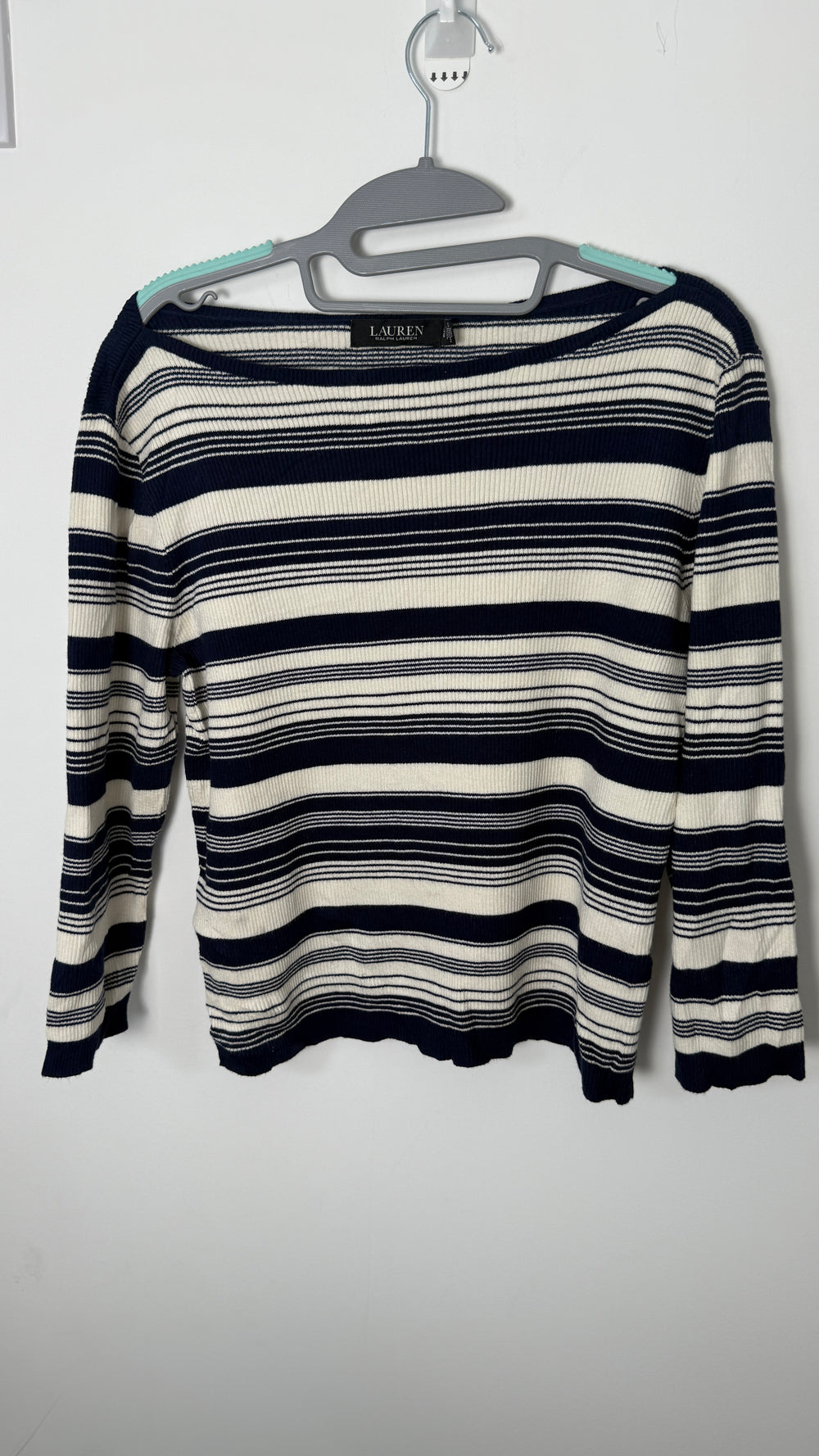 Elevate your wardrobe with the Lauren by Ralph Lauren 1/4 Sleeved Top, featuring classic navy blue and white stripes. Crafted for a timeless look, this top combines refined style with comfortable fit, making it ideal for both casual outings and smart-casual settings. Its quarter-length sleeves offer versatility across seasons, while the quality fabric ensures durability and effortless wear. Perfect for layering or wearing alone, this piece adds a polished touch to any ensemble.