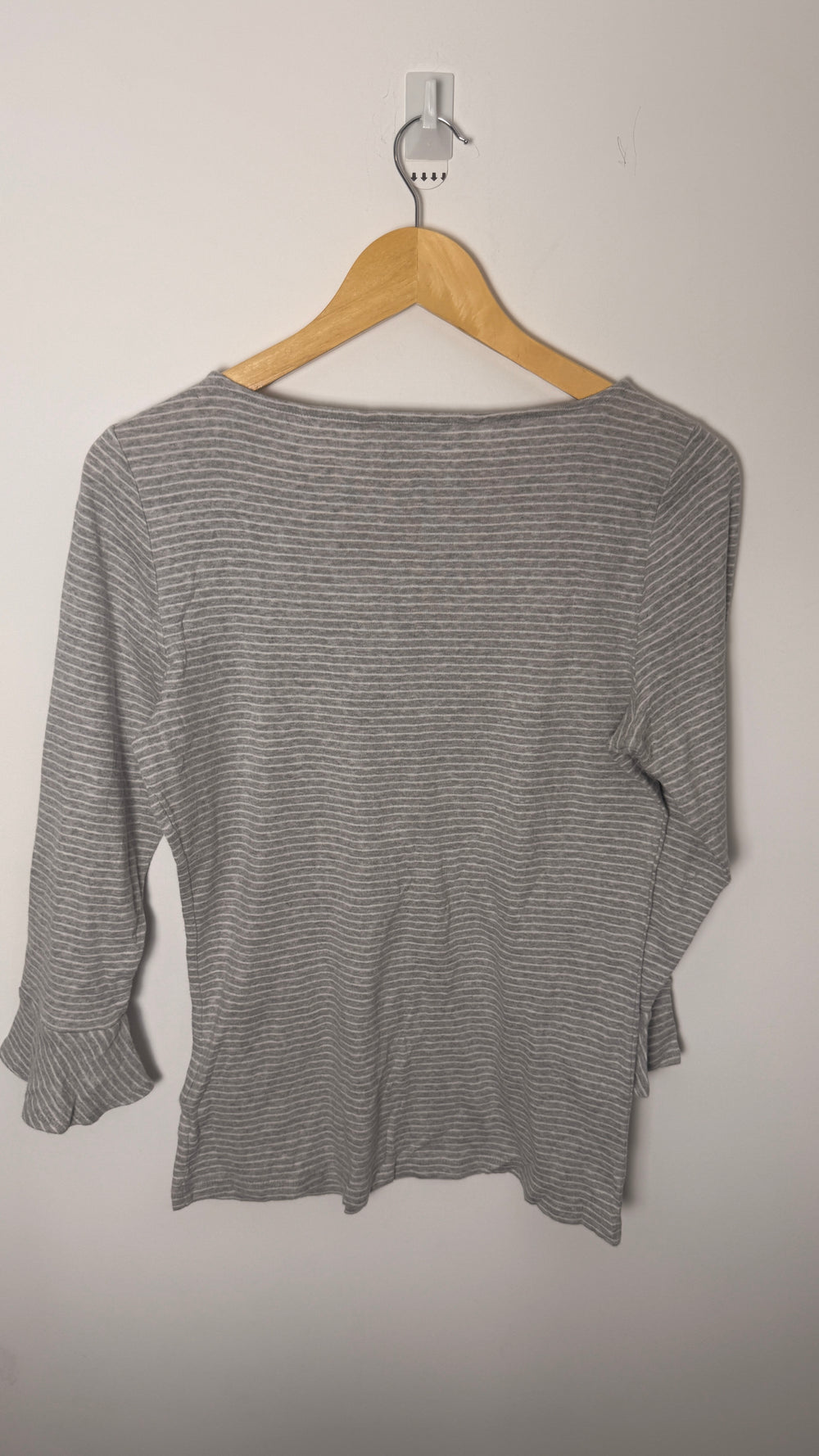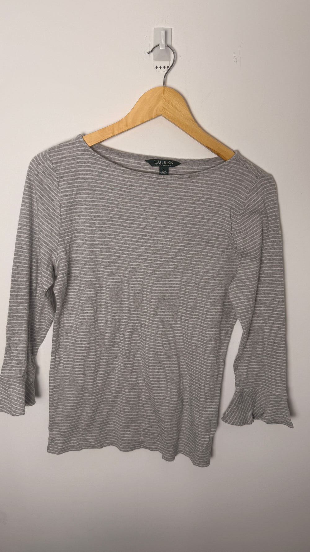 Chic and contemporary, this Lauren by Ralph Lauren Grey and White Top features graceful 3/4 bell sleeves that add a touch of modern elegance. The soft tones and refined silhouette make it a versatile piece, perfect for pairing with jeans or skirts for an effortlessly polished look. A beautiful blend of comfort and sophistication for everyday wear.