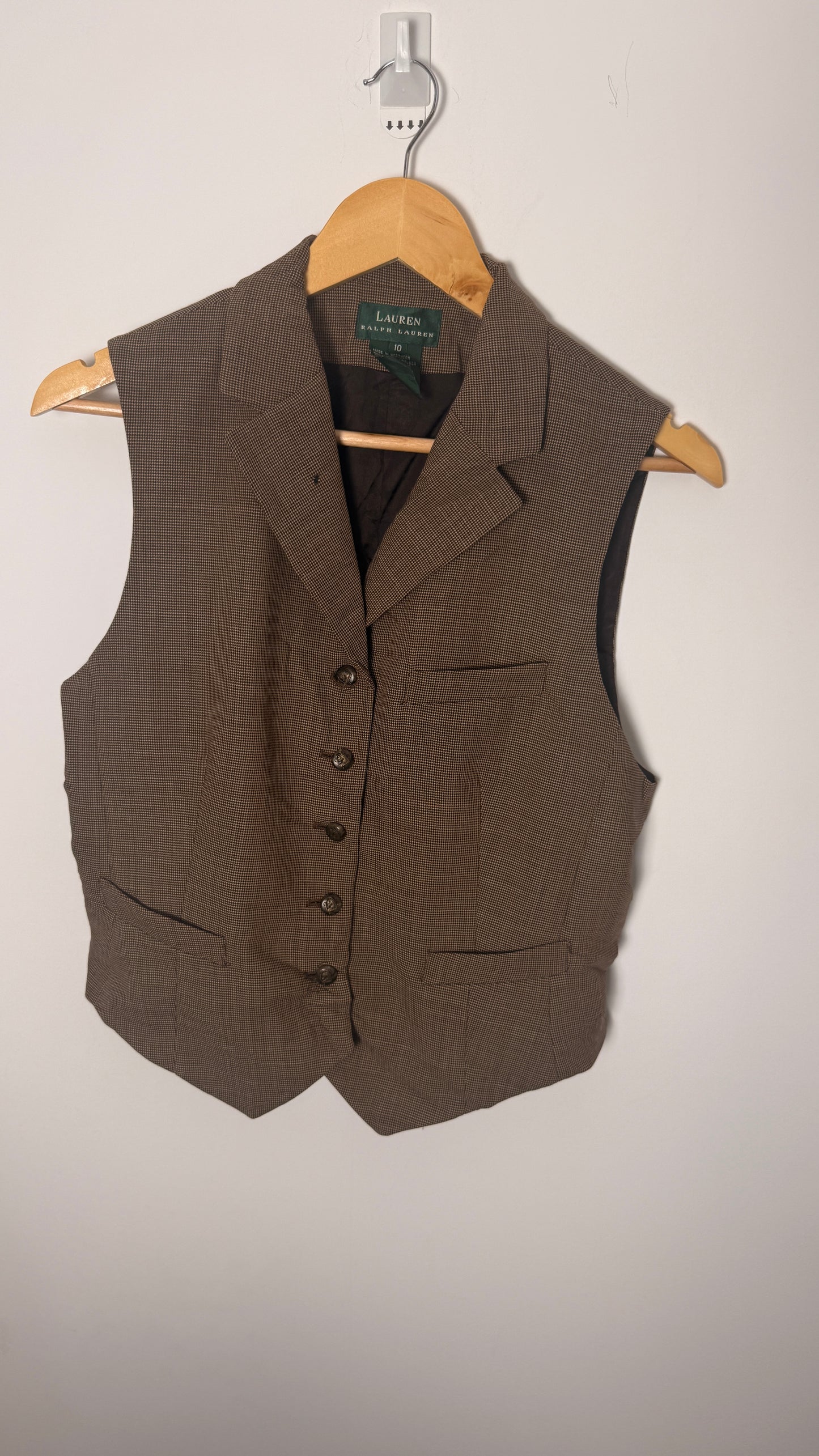 Add a touch of country-inspired elegance with this Lauren by Ralph Lauren Brown Checkered Vest. The timeless pattern and tailored fit make it a stylish layering piece for transitional weather. Designed for both warmth and sophistication, it pairs perfectly with shirts or sweaters for a refined, classic look.
