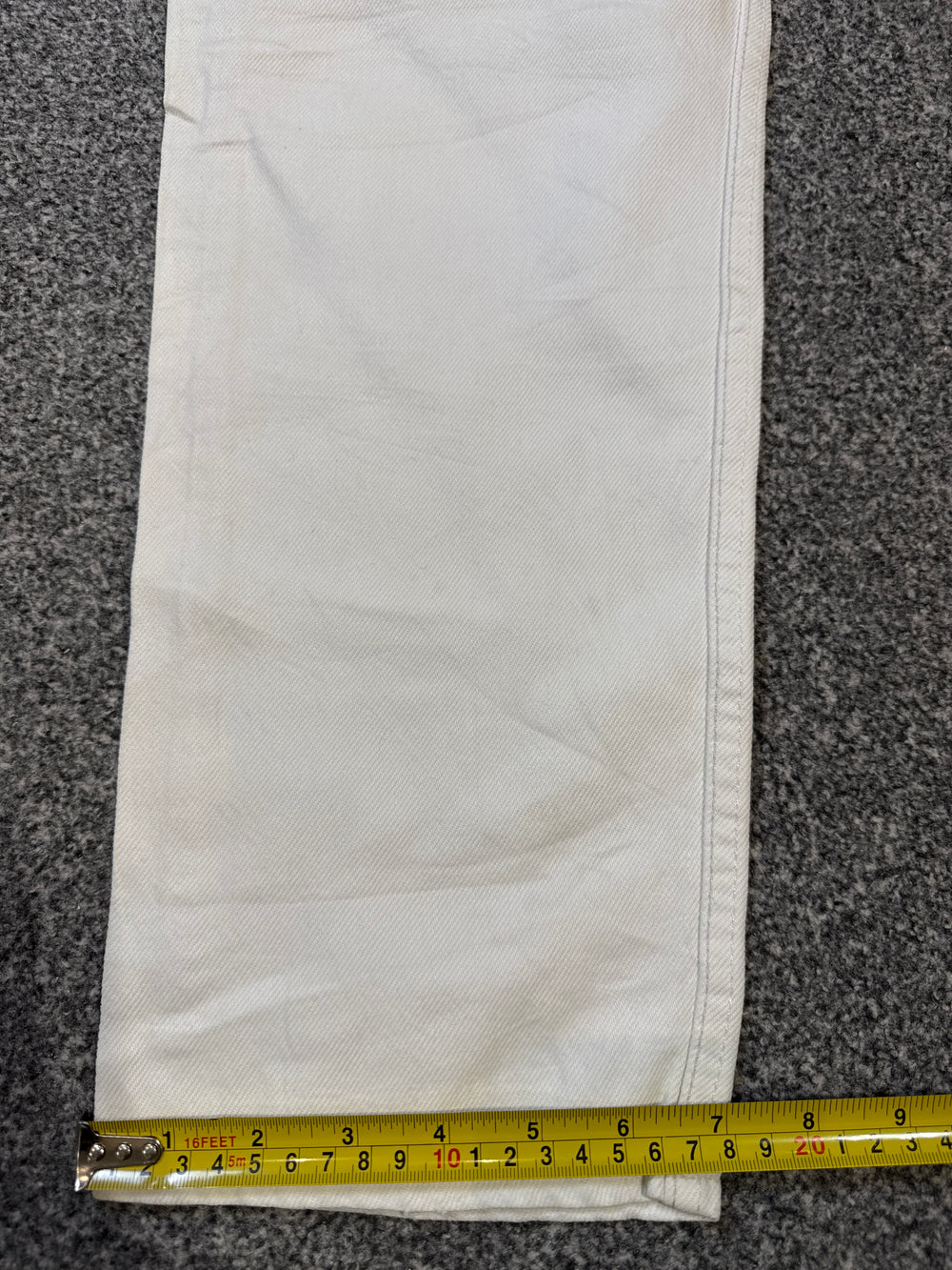 Color & Details: Clean White; features Levi’s iconic orange tab branding, classic five-pocket design, and high-rise cut with straight leg