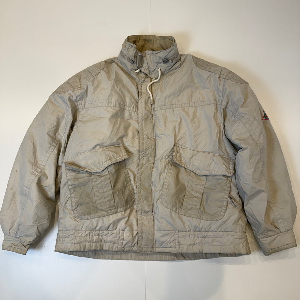 Vintage London Fog insulated jacket featuring large front utility pockets, sleeve logo patch and bold branded interior panel.
