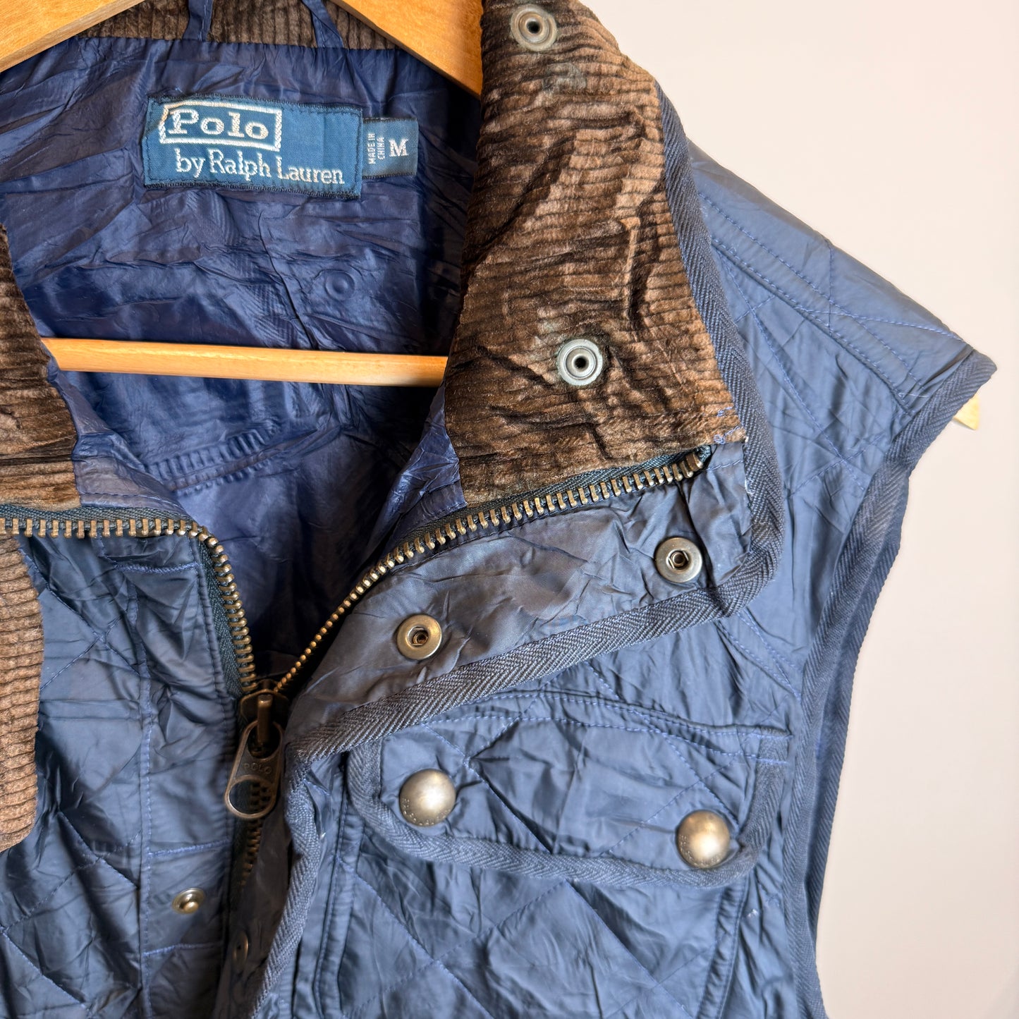Color & Details: Deep Navy quilted exterior with contrasting brown corduroy collar; embroidered Polo logo on chest; dual side pockets