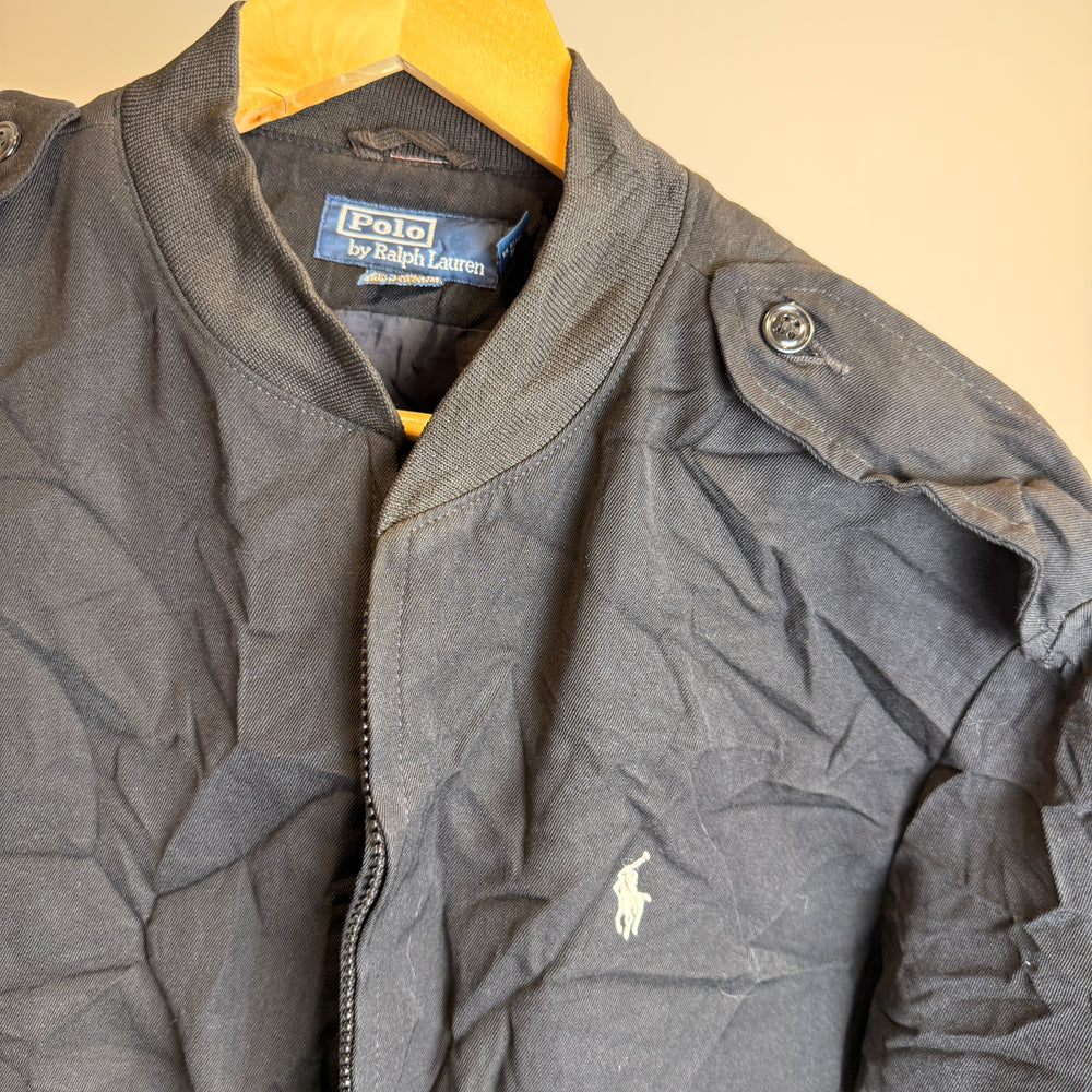 Color & Details: Black with distinctive shoulder cap paneling; embroidered Polo logo on chest; ribbed cuffs and waistband for a structured, athletic silhouette