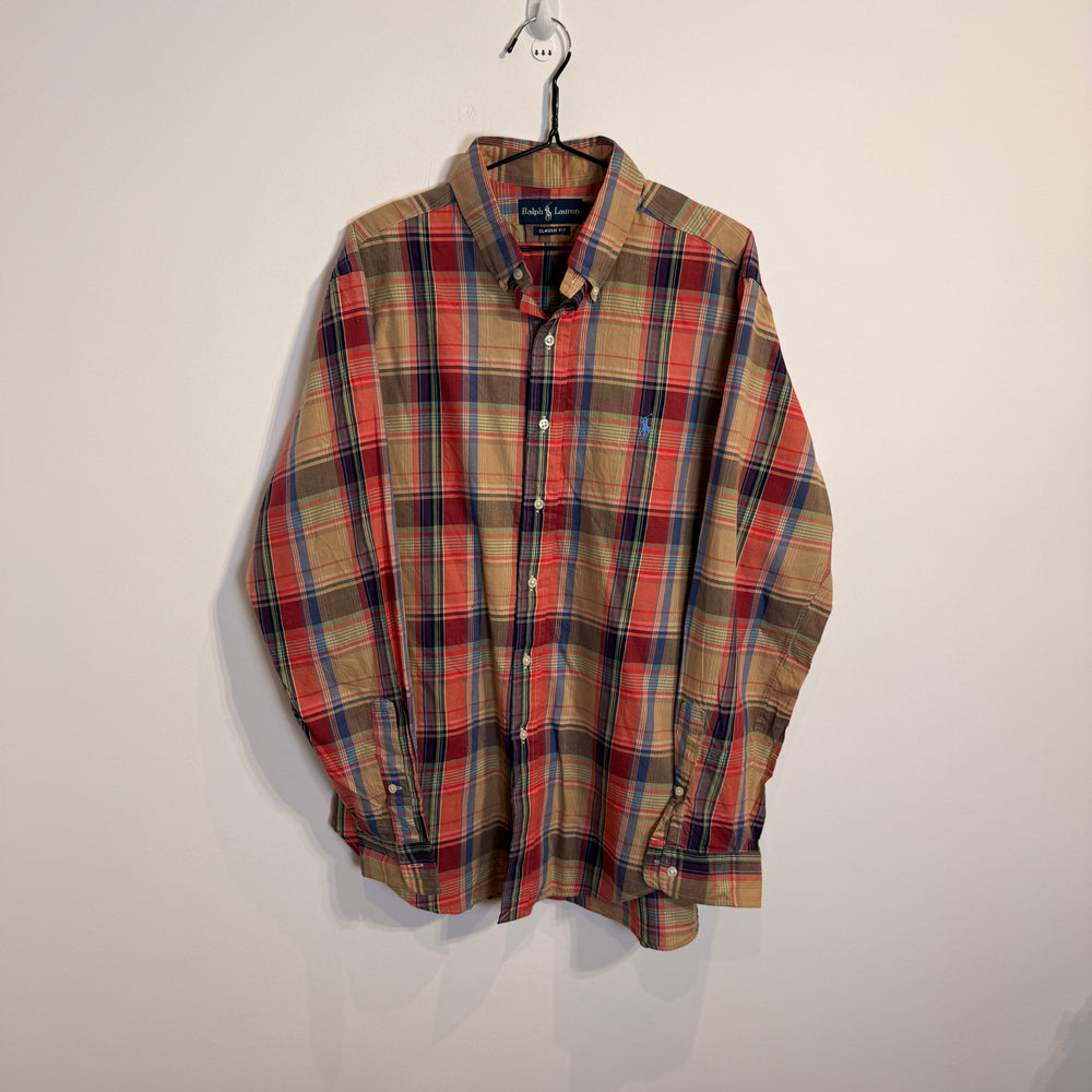 Color & Details: Multicolor plaid pattern featuring retro-inspired tones; embroidered Ralph Lauren pony logo on the chest; button-down collar and single front pocket