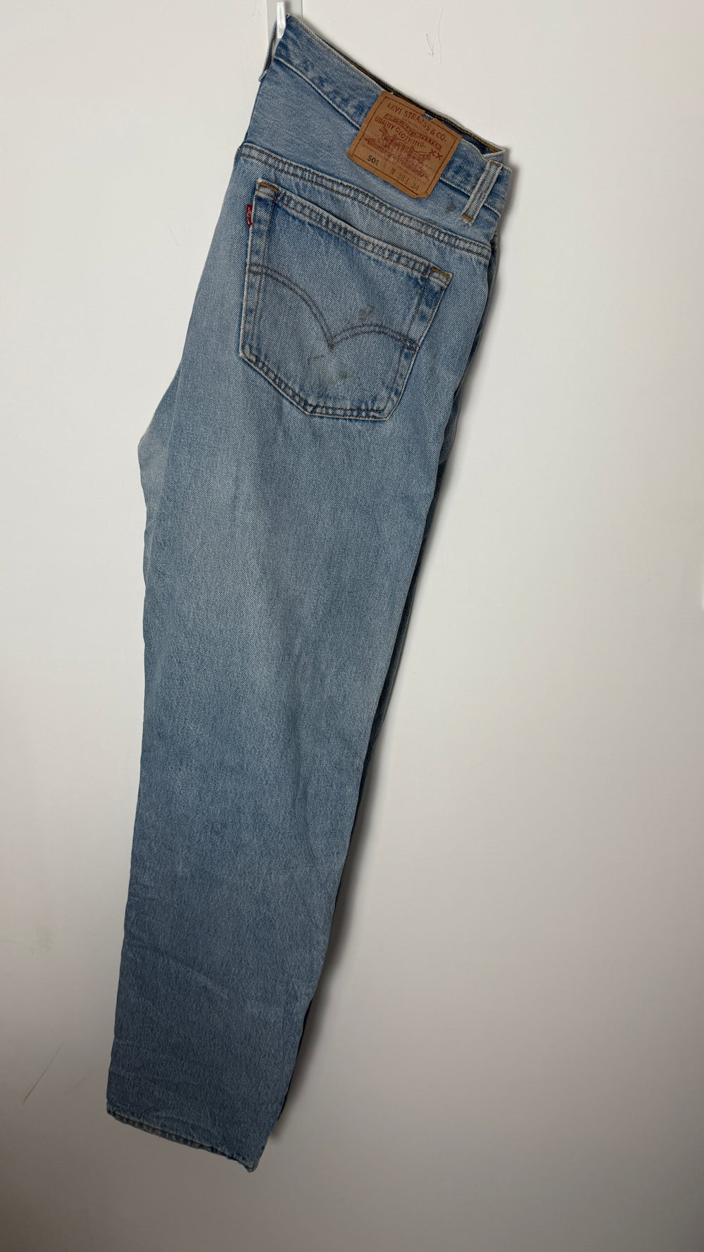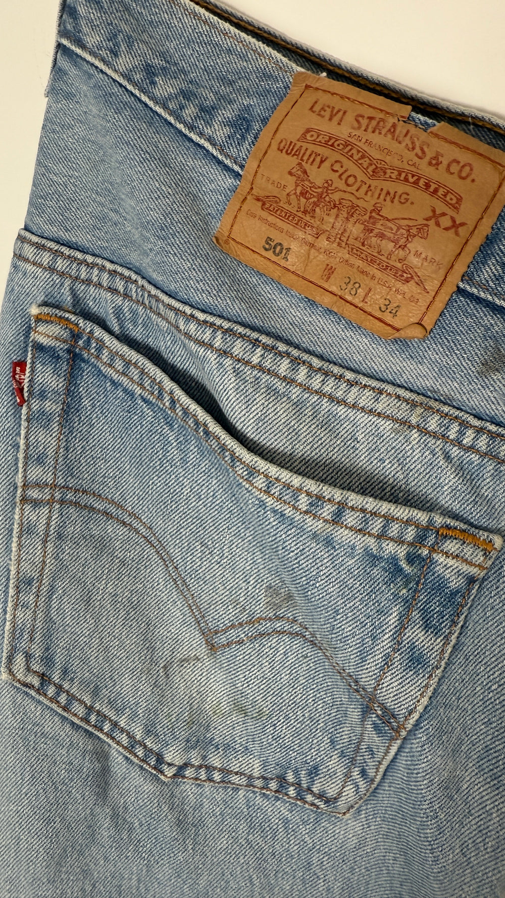 These Rare Vintage Levi's 501 XX jeans, crafted in the USA, feature authentic light blue denim with a classic straight-leg fit. Sized W38 L34, they exemplify enduring quality and heritage denim craftsmanship. The sturdy construction and timeless design make them a prized piece for collectors and enthusiasts seeking genuine vintage Levi's with historical value and exceptional wear character.