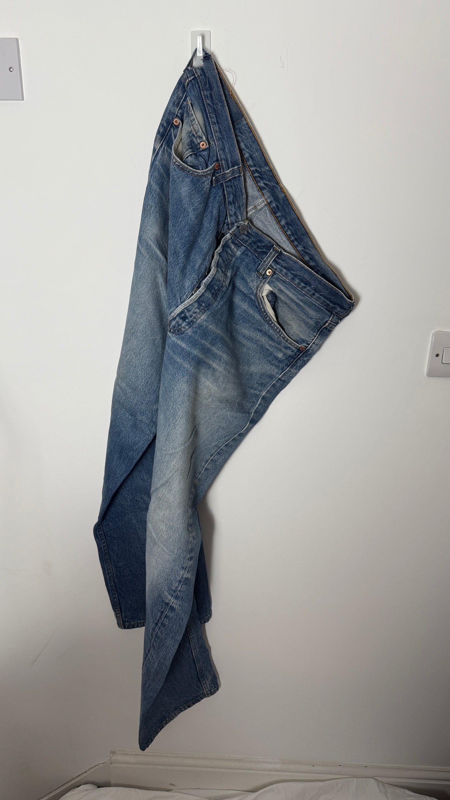 These Rare Vintage Levi's 501 XX jeans, crafted in the USA, showcase authentic denim heritage with their classic faded blue wash. Featuring a W38 L34 fit, they combine durability with timeless style, making them a coveted piece for collectors and denim enthusiasts alike. The naturally worn finish highlights their genuine vintage character and quality craftsmanship.