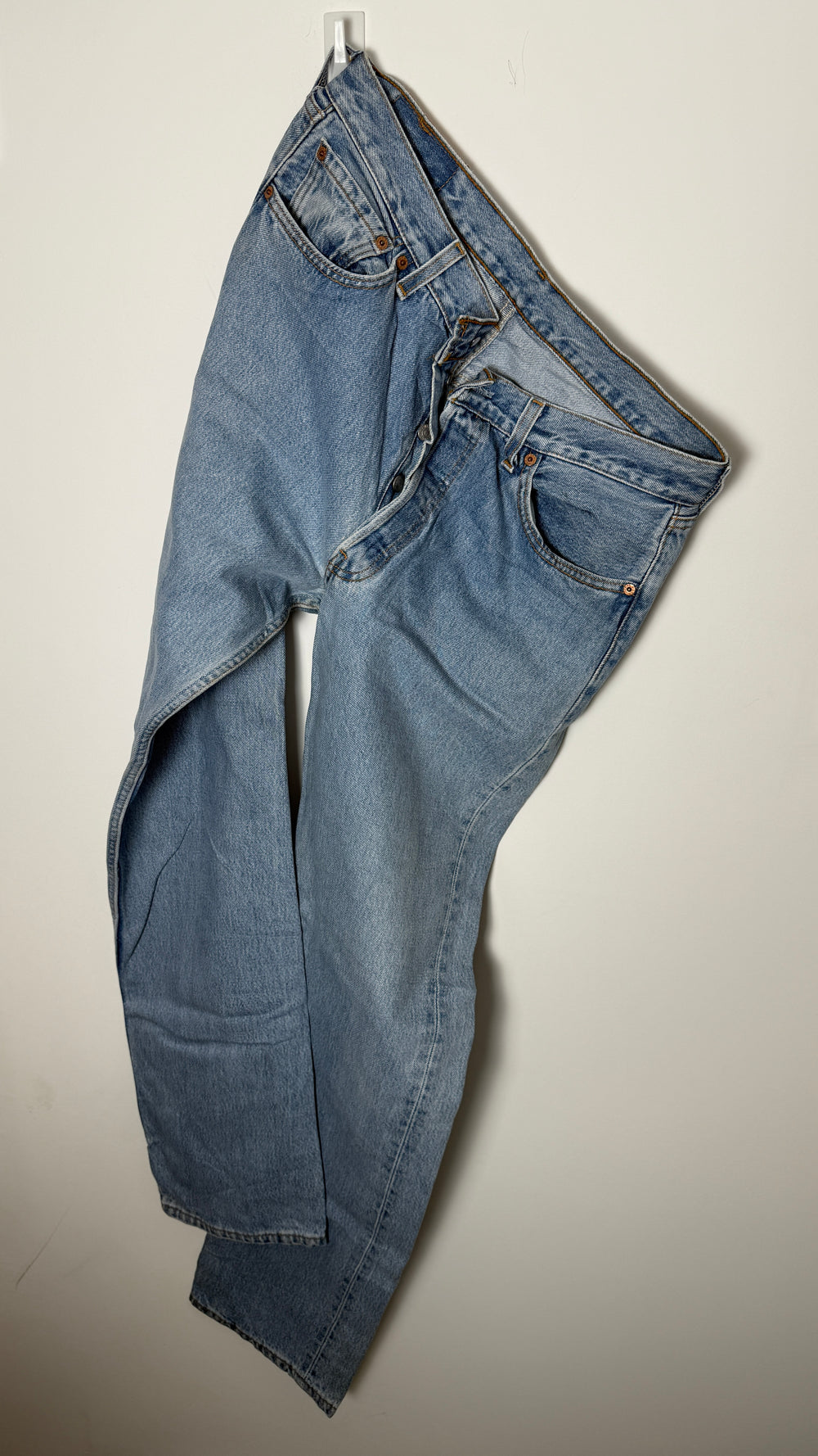 These Rare Vintage Levi's 501 XX jeans showcase authentic American craftsmanship with their original USA-made denim. The light blue fade highlights natural wear patterns, emphasizing their timeless character. Renowned for their durable construction and classic straight-leg fit, these jeans offer both heritage style and lasting quality for collectors and enthusiasts alike.