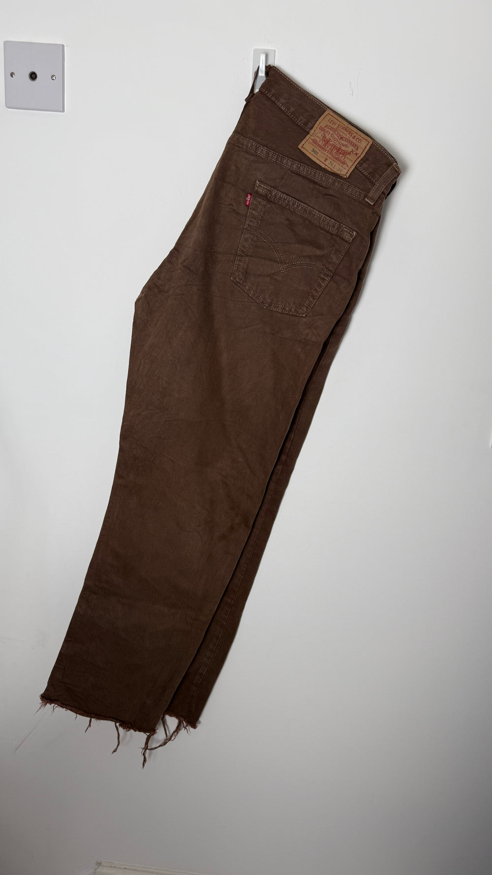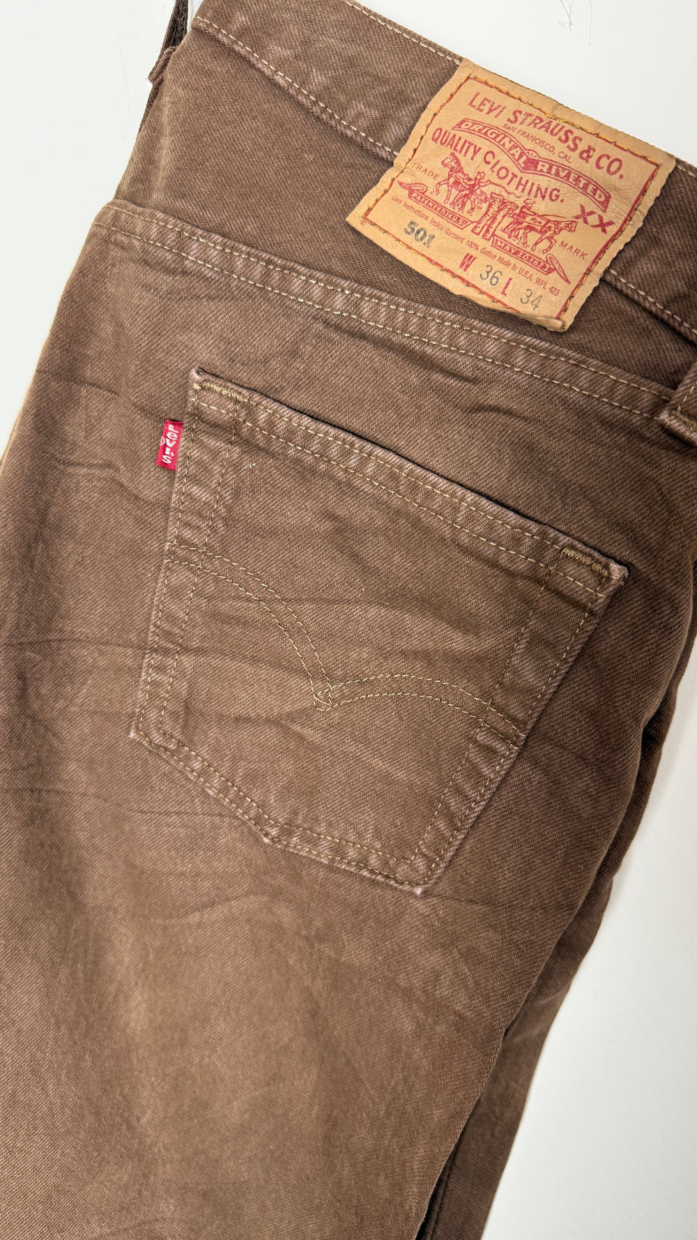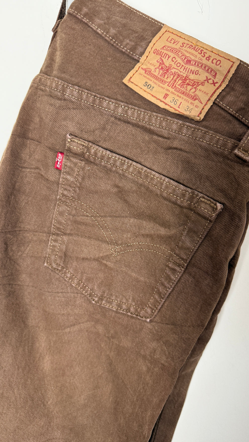 These rare vintage Levi's 501 XX jeans, crafted in the USA, showcase authentic distressed brown denim with classic detailing. Renowned for their enduring quality and iconic fit, they embody timeless craftsmanship. The worn-in texture adds character and a unique vintage appeal, making them a prized addition for collectors and denim enthusiasts alike.
