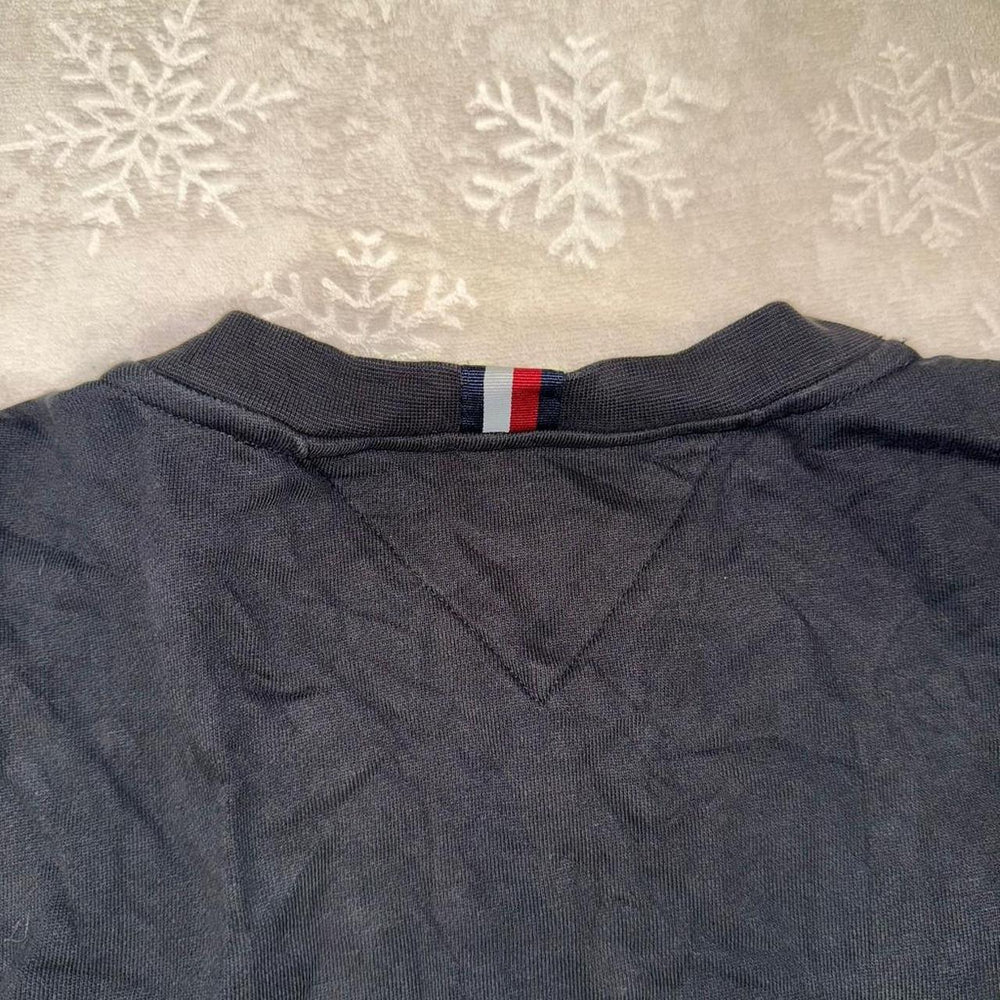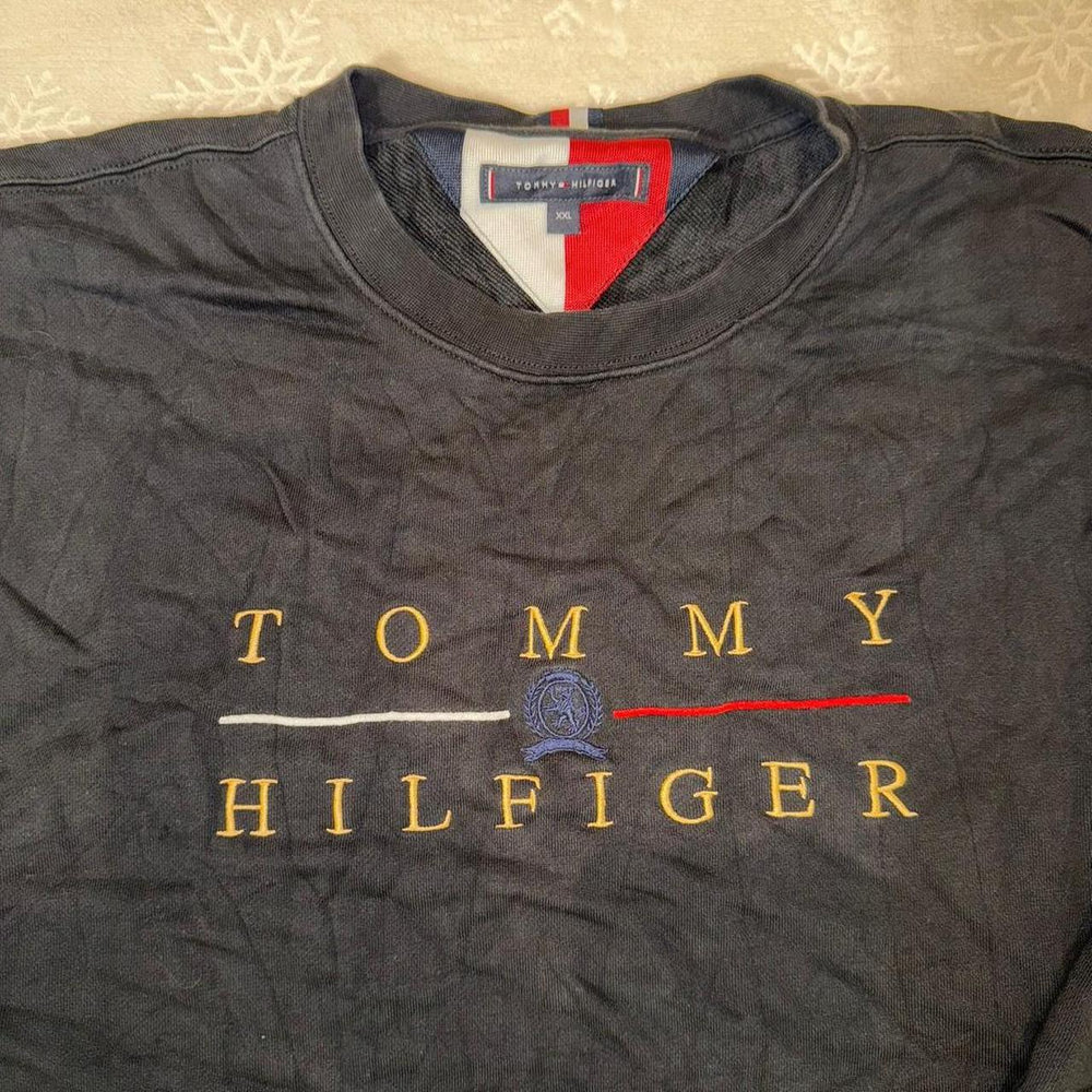 Authentic Tommy Hilfiger black crewneck sweatshirt featuring classic embroidered Tommy Hilfiger logo across the chest with crest detailing. Iconic red, white, and blue branding at the neckline and inner collar. Timeless vintage style with a relaxed, comfortable fit.