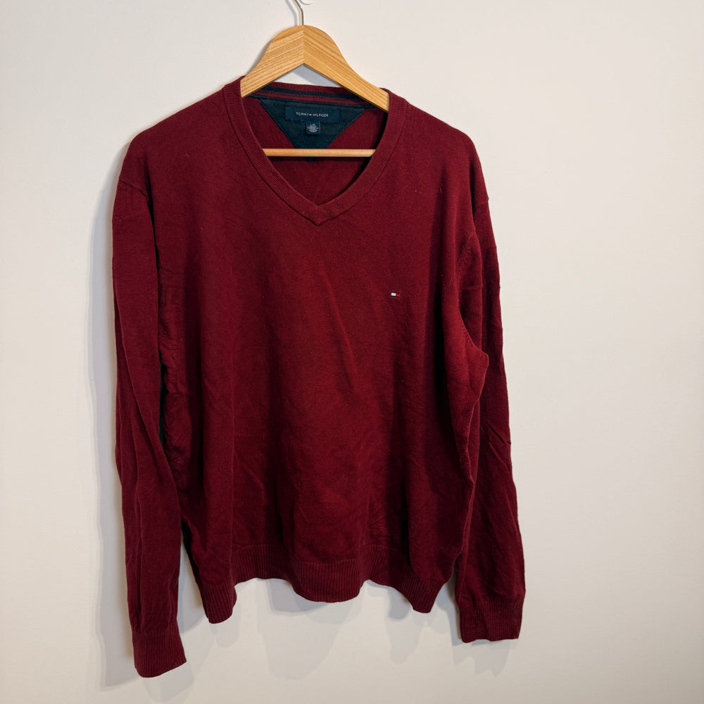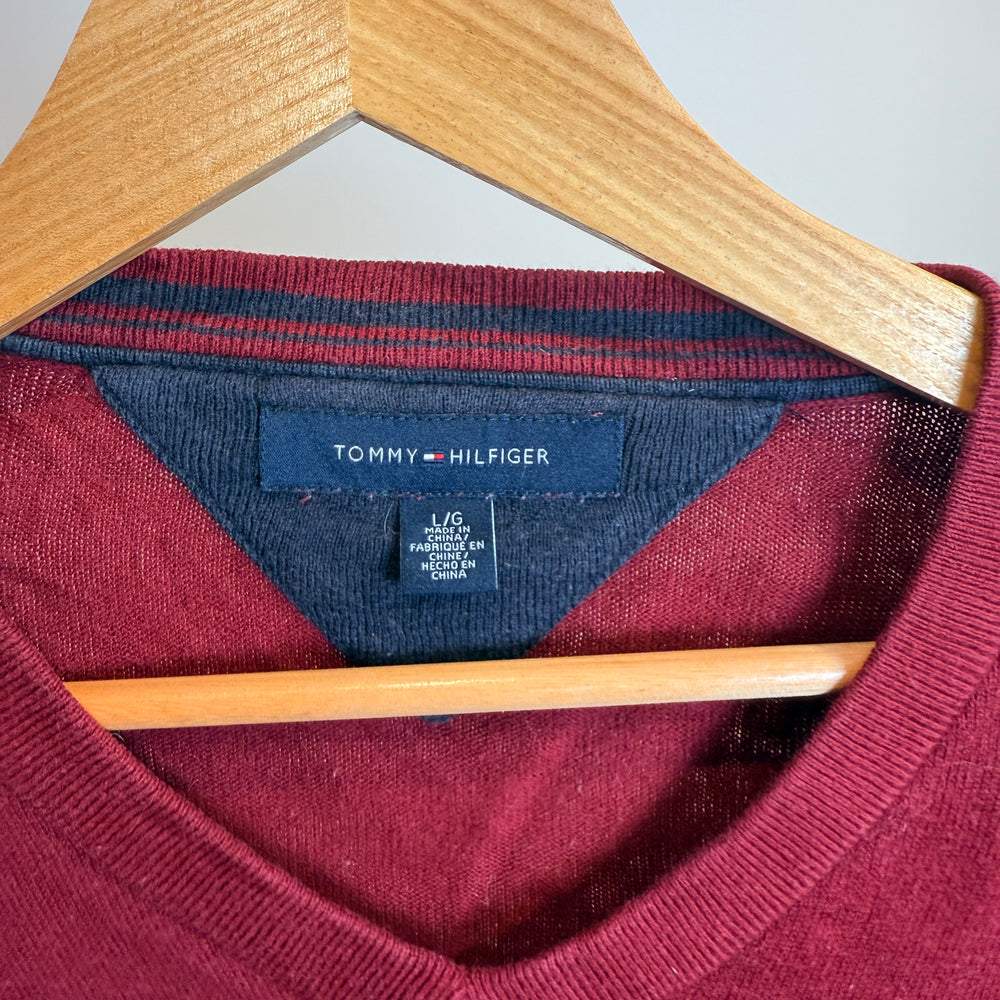 Classic and refined, this Tommy Hilfiger Burgundy V-Neck Jumper delivers effortless sophistication and everyday comfort. The rich hue pairs perfectly with jeans or chinos, while the soft cotton knit ensures a lightweight, breathable feel. A wardrobe staple that captures Tommy Hilfiger’s signature preppy elegance.