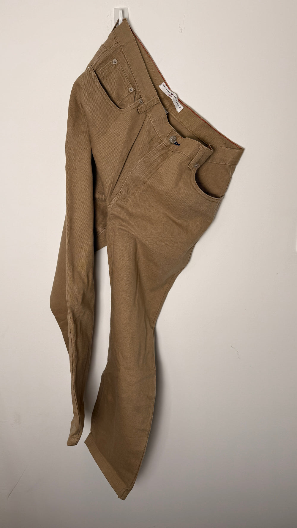 Color & Details: Camel; neutral-toned denim with Tommy Hilfiger flag detail on back pocket and tonal stitching