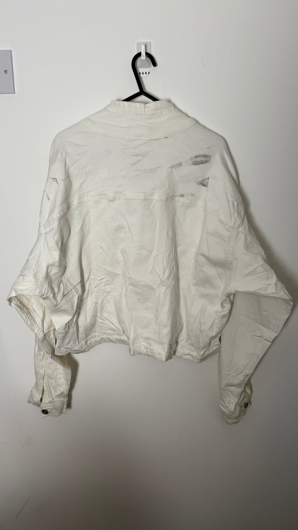 This Vintage Nautica Jeans Company white cropped denim jacket blends classic design with a modern silhouette. Crafted with durable denim, it offers a structured yet comfortable fit ideal for layering. Its cropped length complements high-waisted styles, making it a versatile addition to any wardrobe. Perfect for those seeking timeless Americana fashion with a contemporary edge.