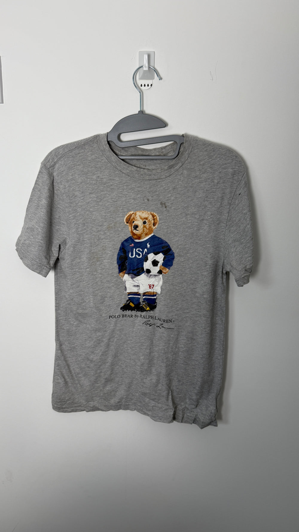 This vintage Y2K Ralph Lauren Polo Bear T-shirt in grey exemplifies timeless Americana style. Crafted from soft, high-quality fabric, it features the iconic Polo Bear dressed in sporty USA apparel, showcasing Ralph Lauren's heritage and attention to detail. Its classic fit and subtle grey tone make it a versatile piece for collectors and fashion enthusiasts seeking authentic early 2000s charm with enduring comfort and casual elegance.